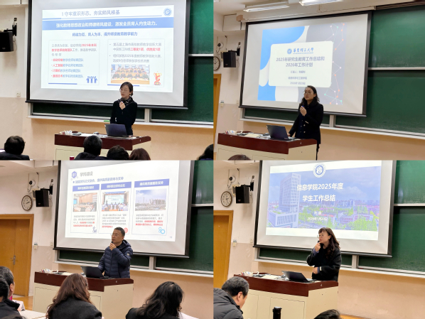 会上,学院院长钟伟民,副院长和望利、谭帅,副书记许浩,分别围绕“科研和学科工作”“研究生教育教学工作”“本科教育教学工作”和“学生工作”作专题汇报,系统回顾了2025年取得的主要成绩,结合学科专业数据资源建设深入剖析当前存在问题,并结合“十五五”规划明确了2026年的工作重点。